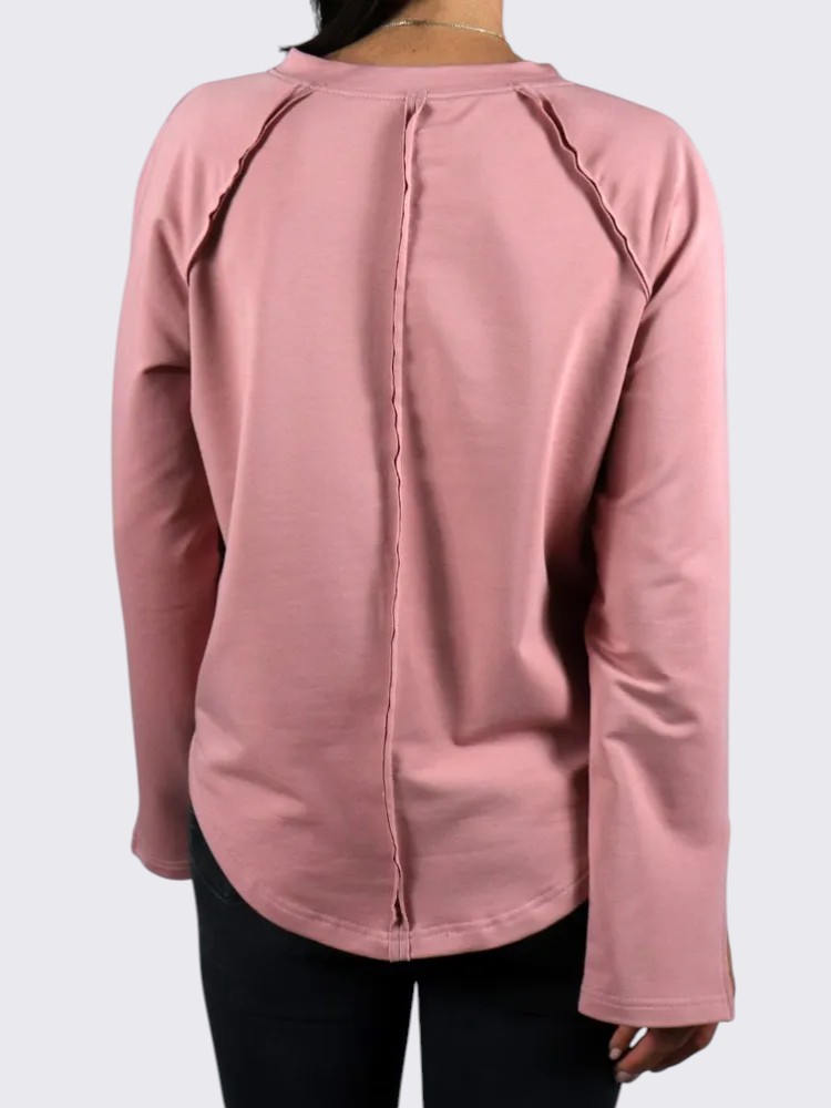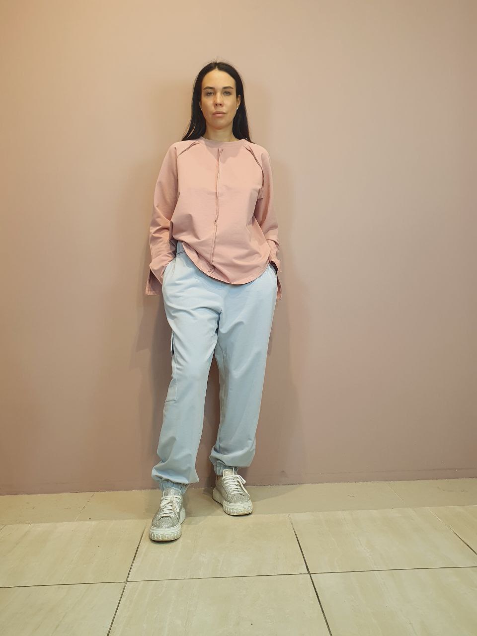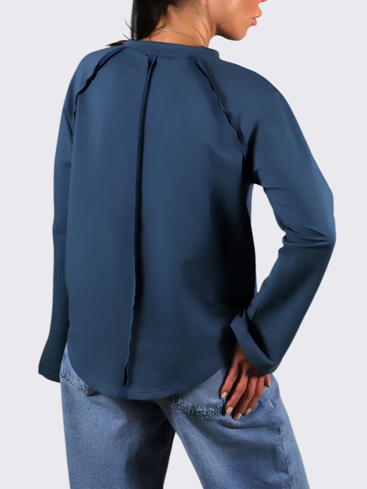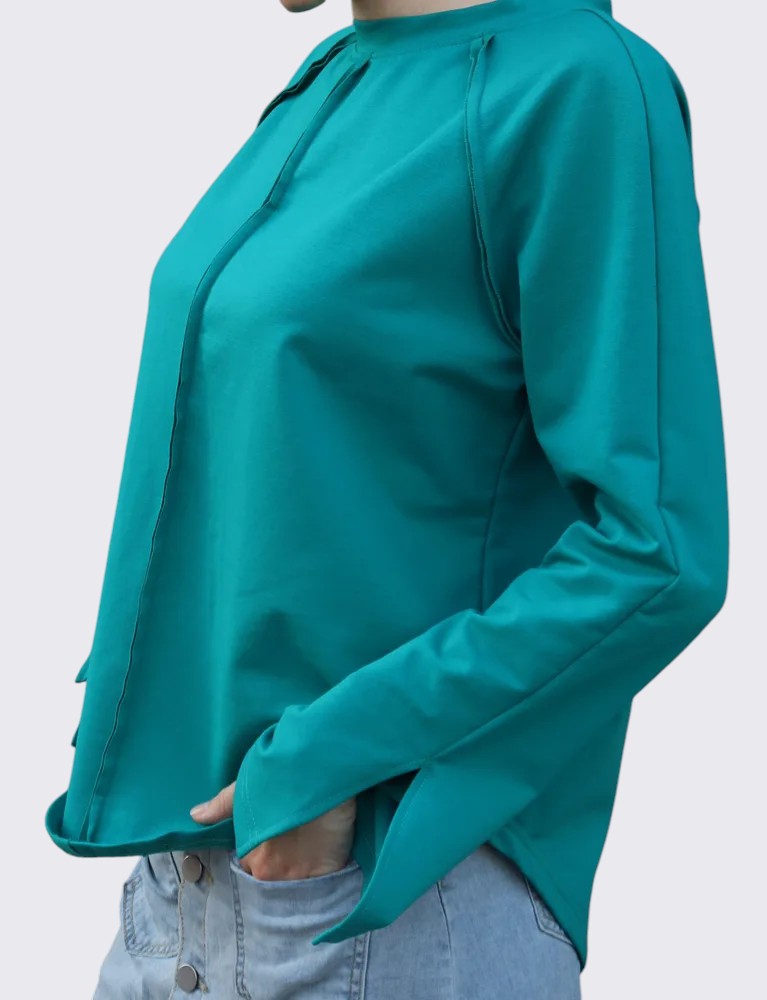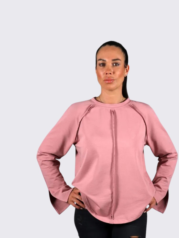 - Детали и конструкция: округлый вырез, длинные рукава с небольшими разрезами у манжет, декоративный центральный шов спереди, закруглённый низ. Минималистичный дизайн делает модель универсальной базой для образов.