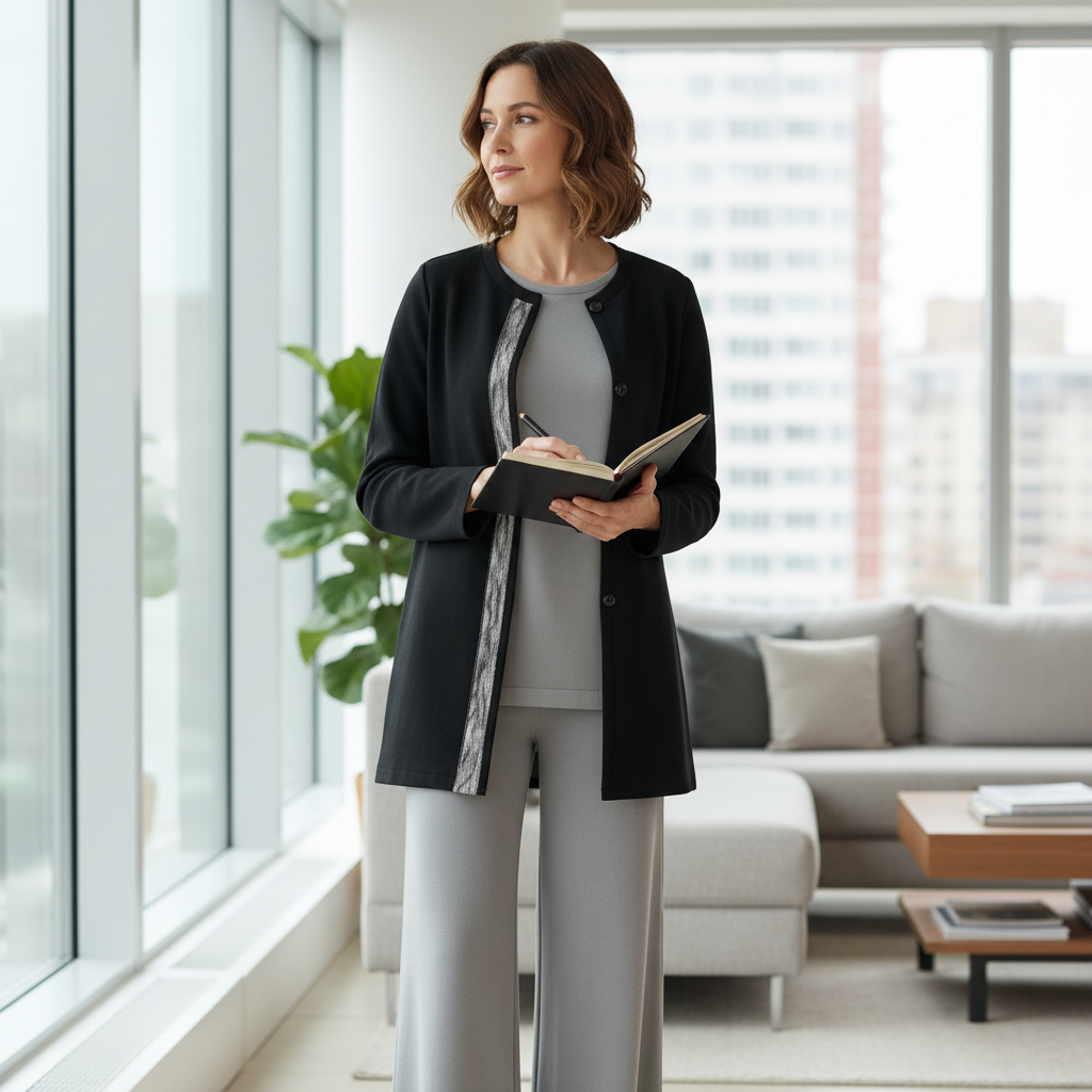 Силуэт: relaxed/straight, длина до середины бедра — подходит для многослойности и лёгкой драпировки.