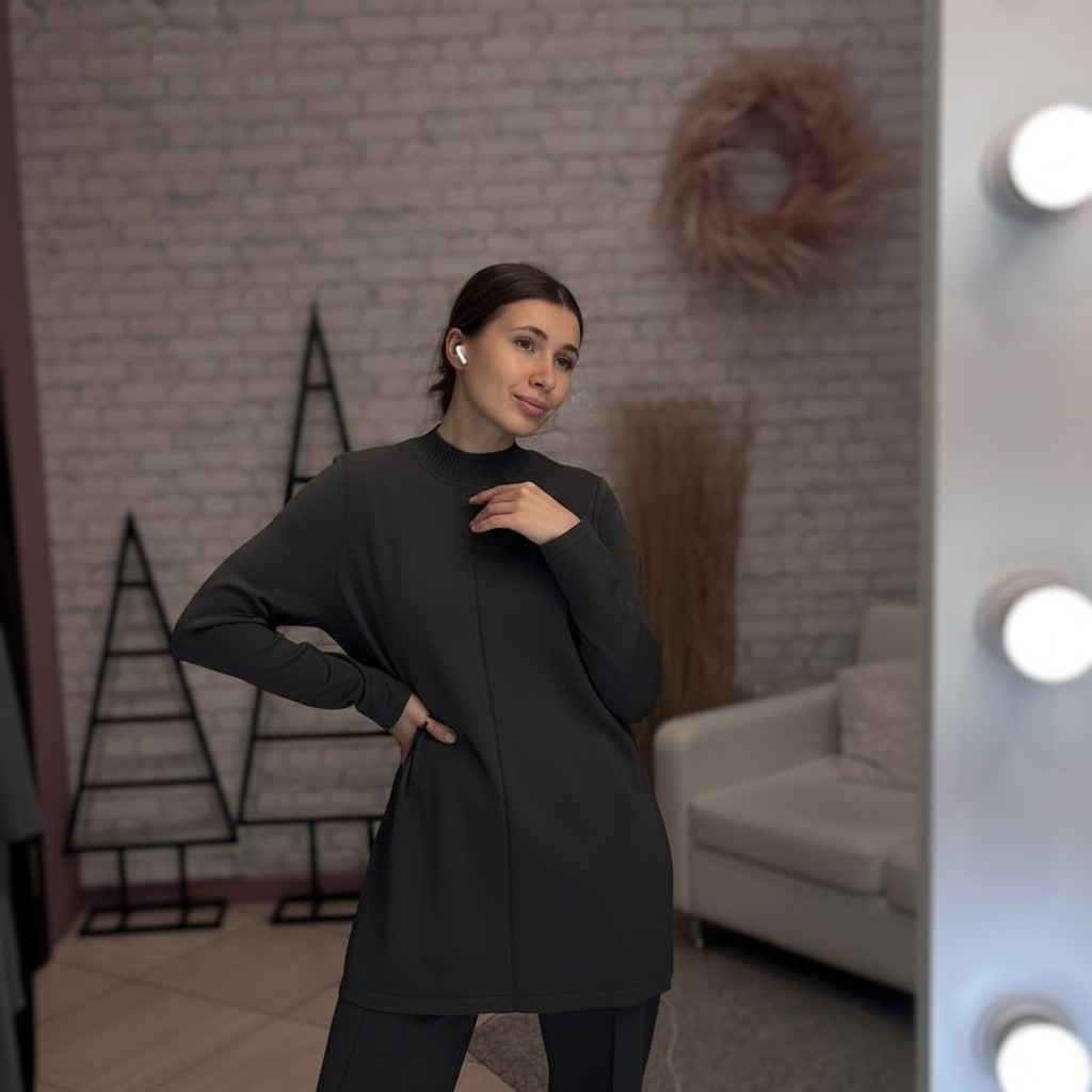 - Материал: плотный драпирующийся трикотаж — мягкий на ощупь, держит форму и комфортен в носке.