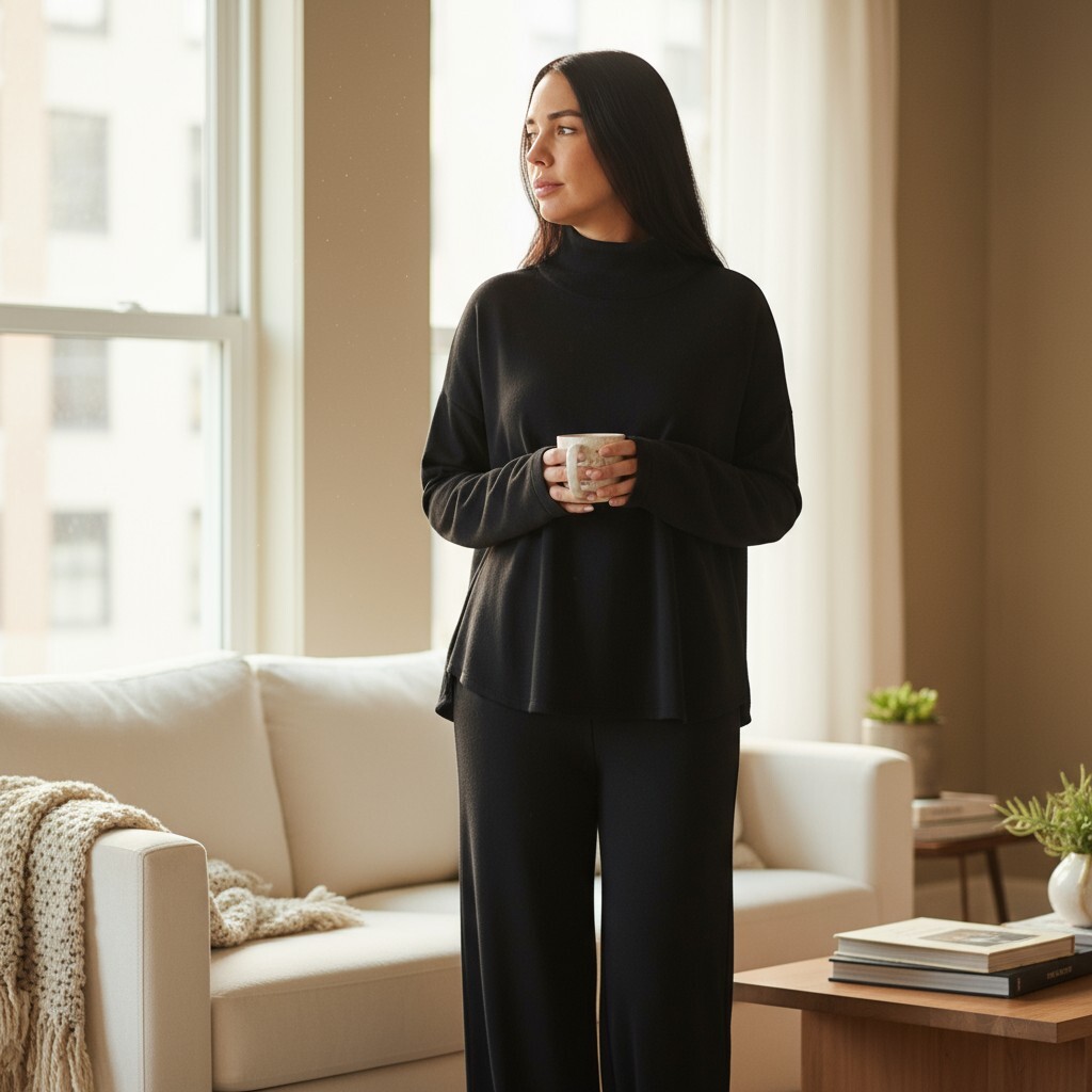 - Воротник: высокий (гольф/фальш‑хомут) — дополнительно согревает и формирует аккуратный образ.