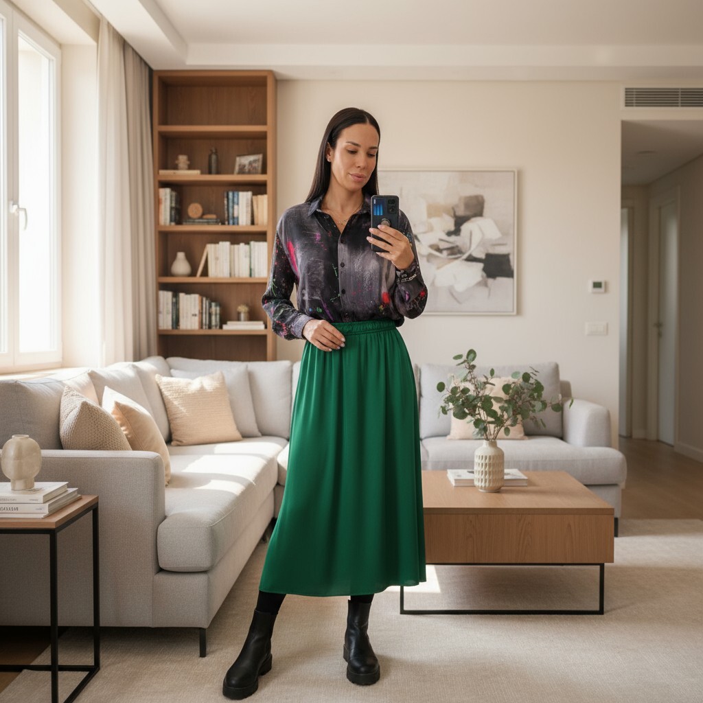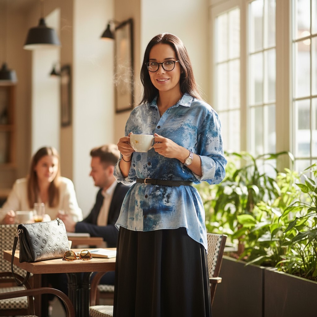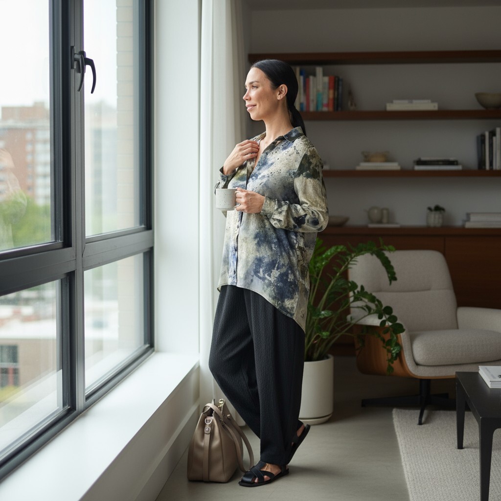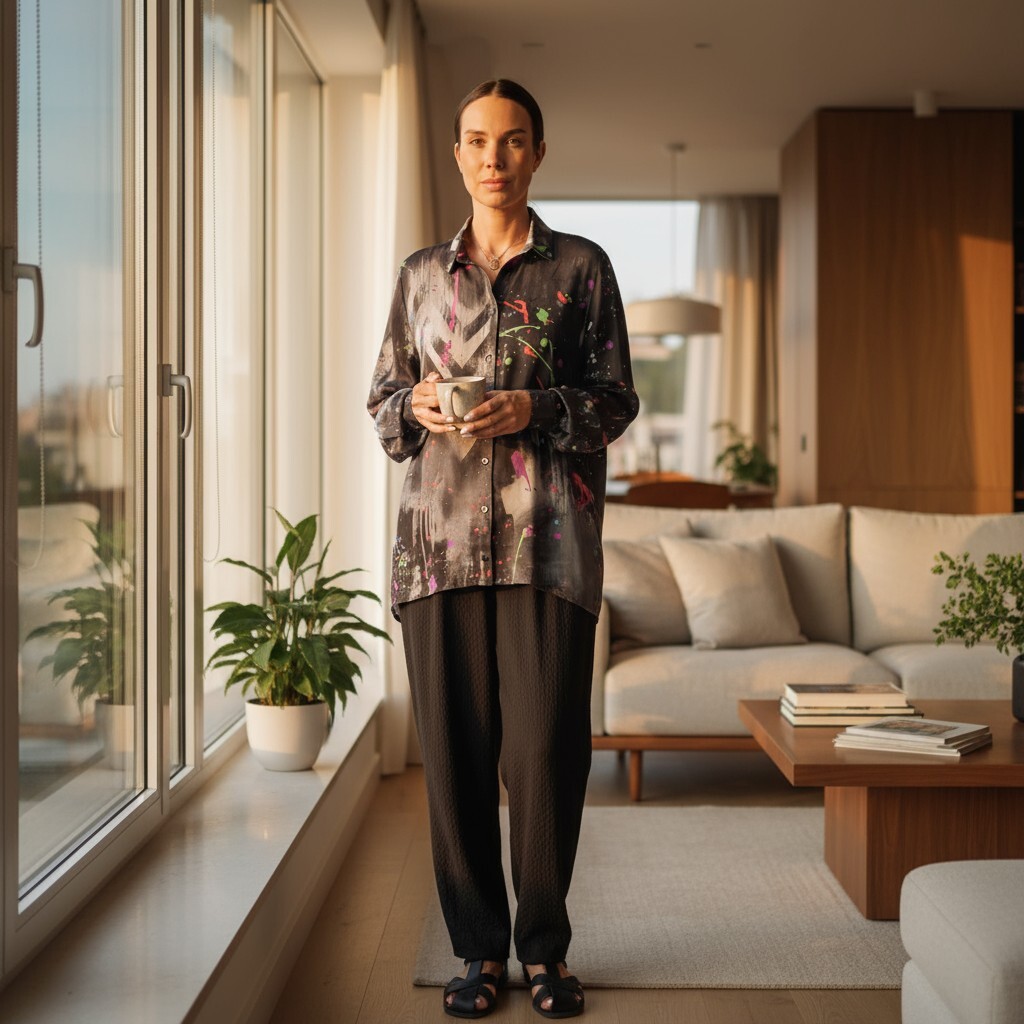 - Детали: плавные боковые линии, естественные складки ткани, аккуратная застёжка‑пуговицы.