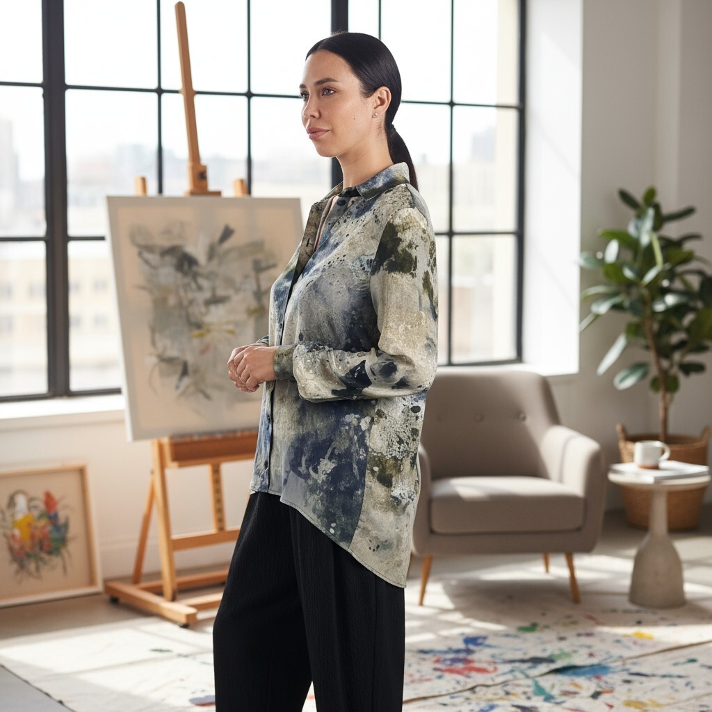 - Принты/цвета: варианты в голубой акварели, зелёно‑песочной фактуре и чёрном с цветными брызгами .