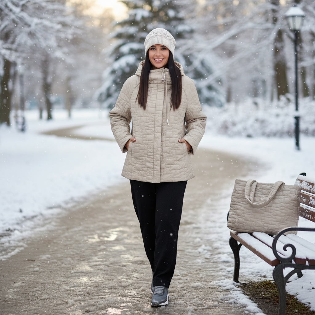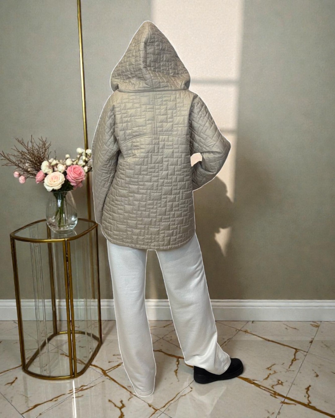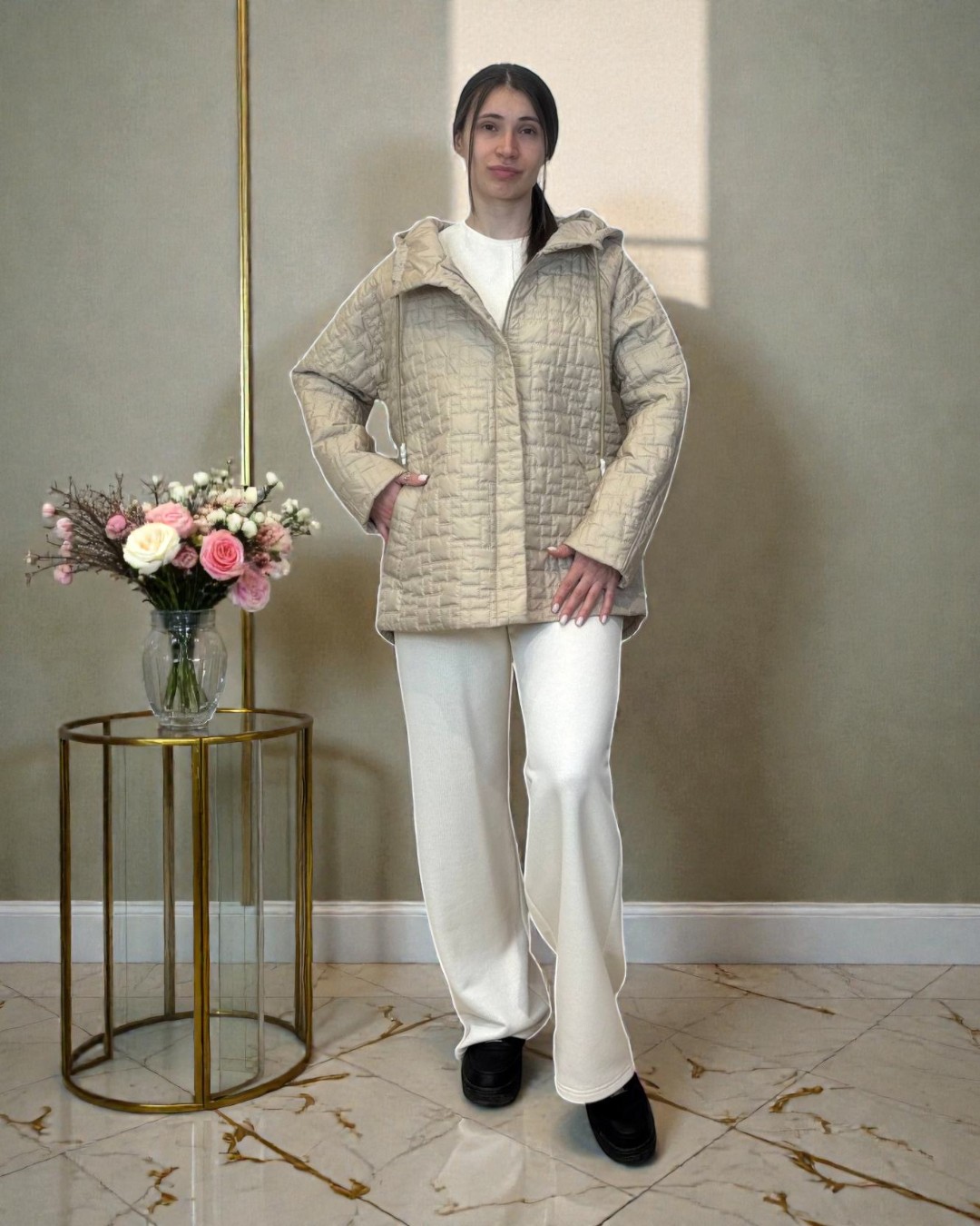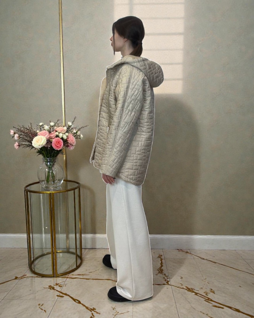 - Дизайн: квадратная стёжка, скрытая планка застёжки, капюшон с утяжкой, боковые карманы, аккуратные швы и минимальная фурнитура для сдержанного городского стиля.