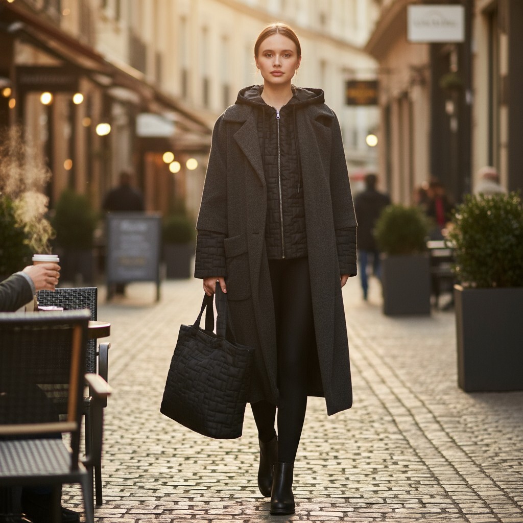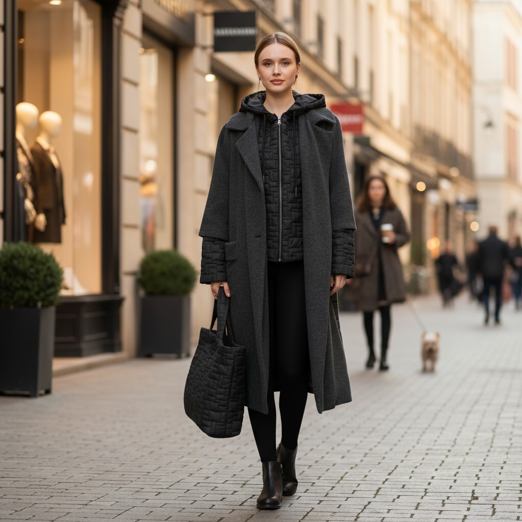 Удобный капюшон защищает от ветра и непогоды, а классический отложной воротник добавляет элегантности.