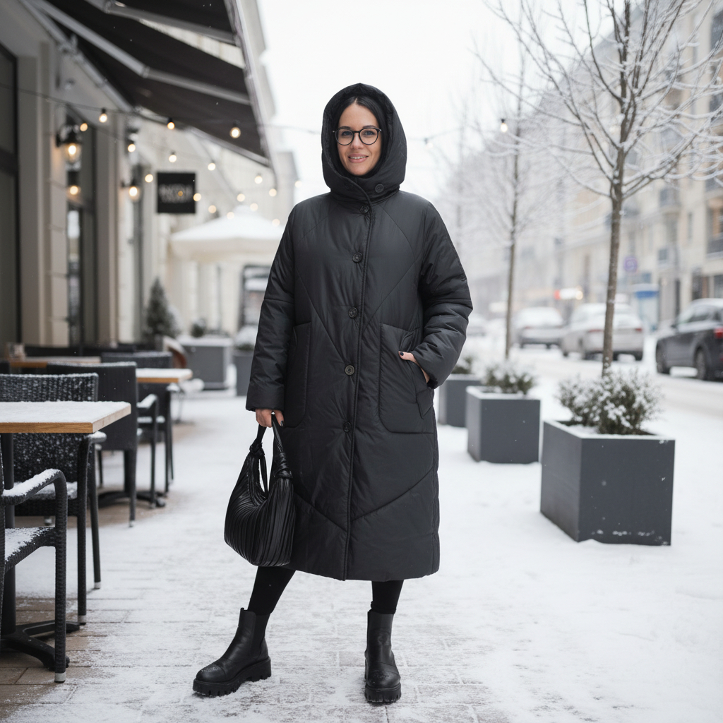- Модель: удлинённое стёганое пальто в свободном/оверсайз силуэте — лёгкий трапециевидный крой, длина до середины голени.