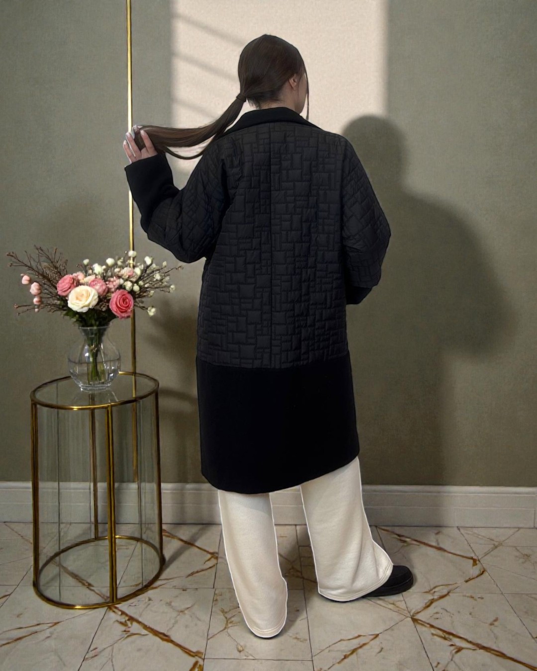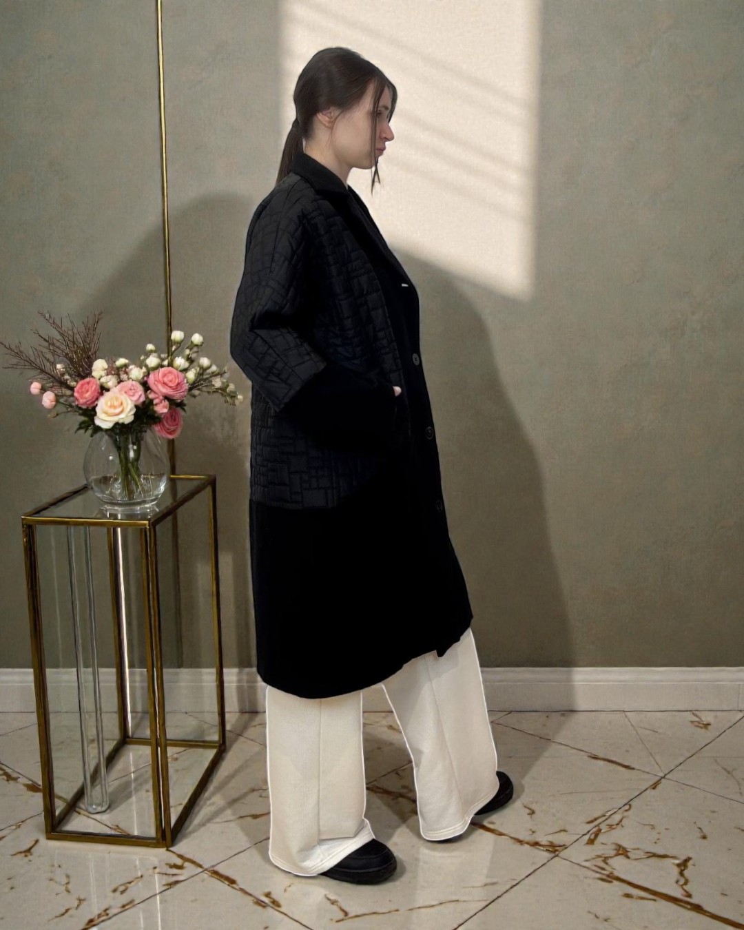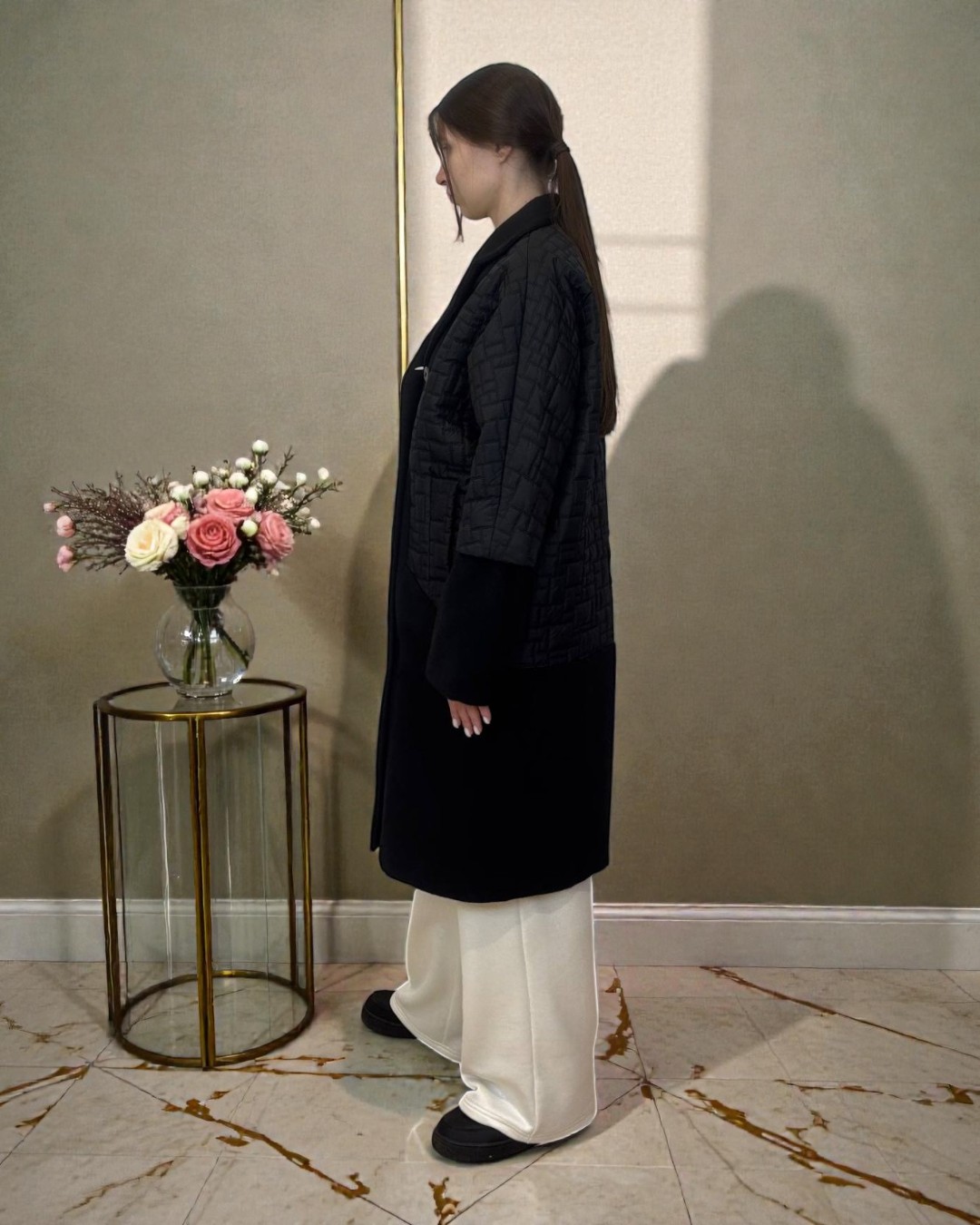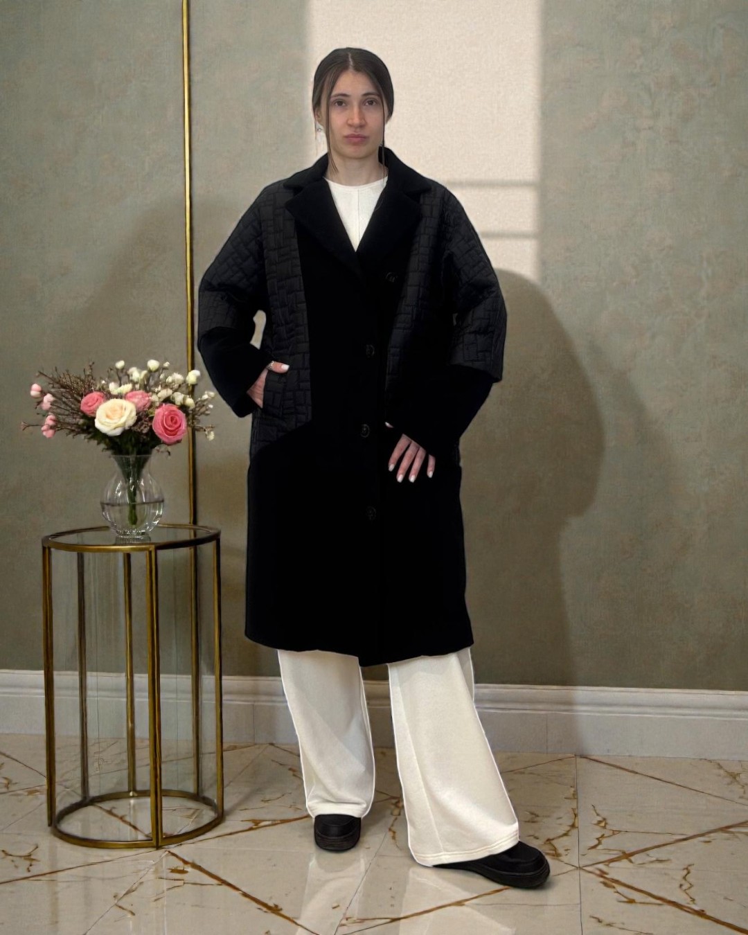 Современное пальто свободного кроя с оригинальными фактурными вставками.