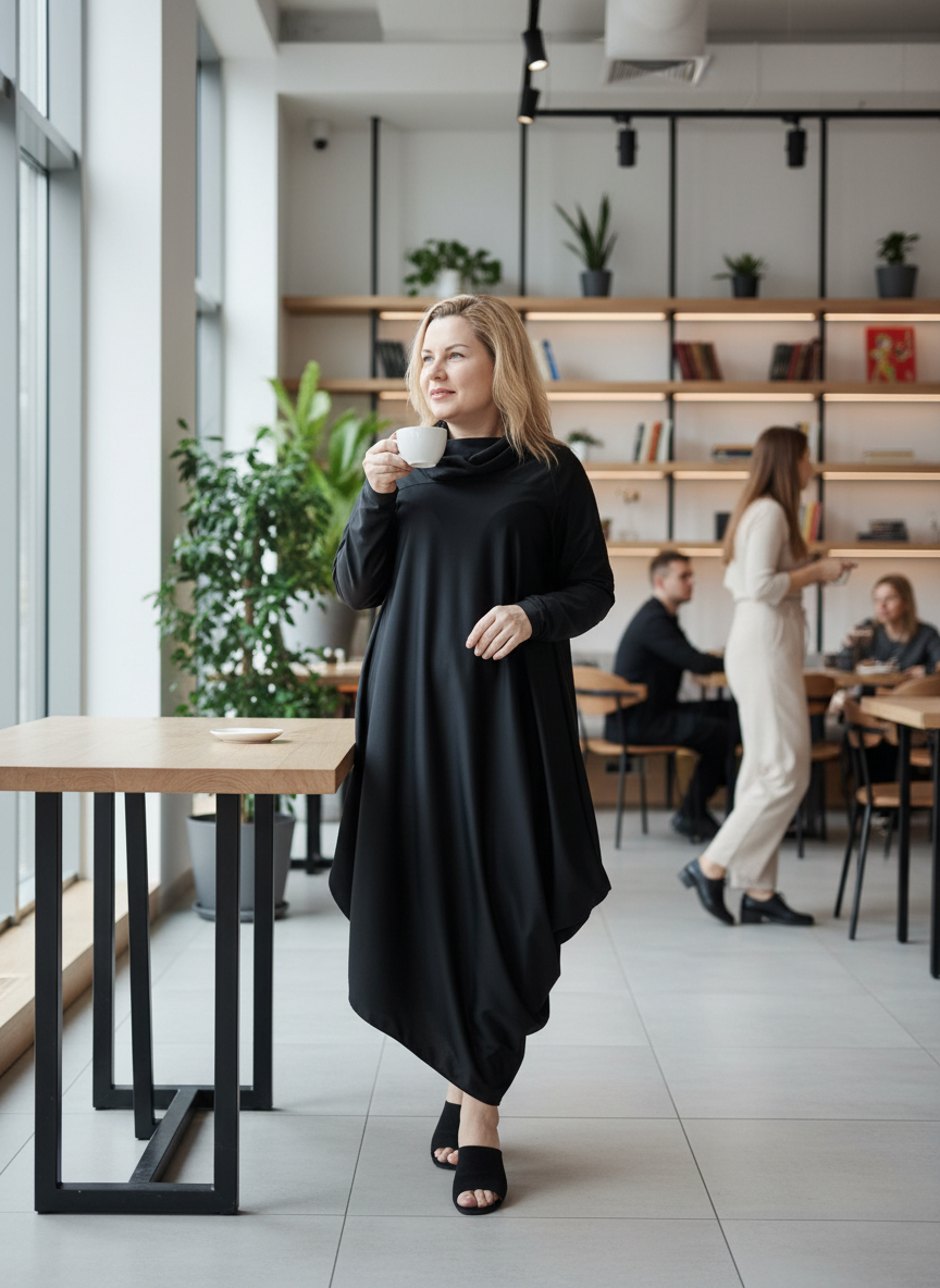 - Вырез: мягкая высокая горловина/слегка драпирующаяся стойка, аккуратно обрамляет шею.