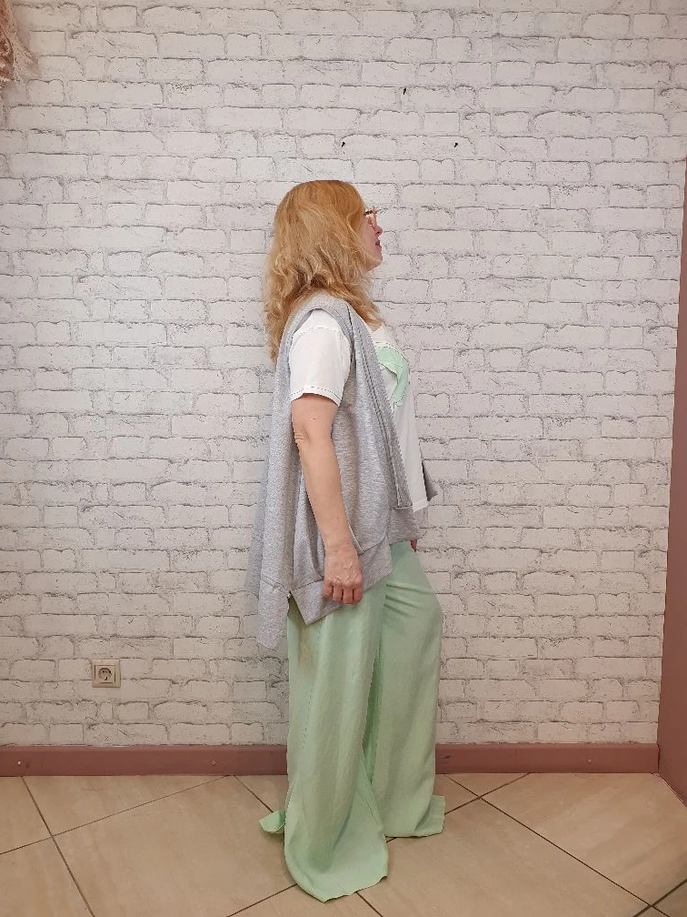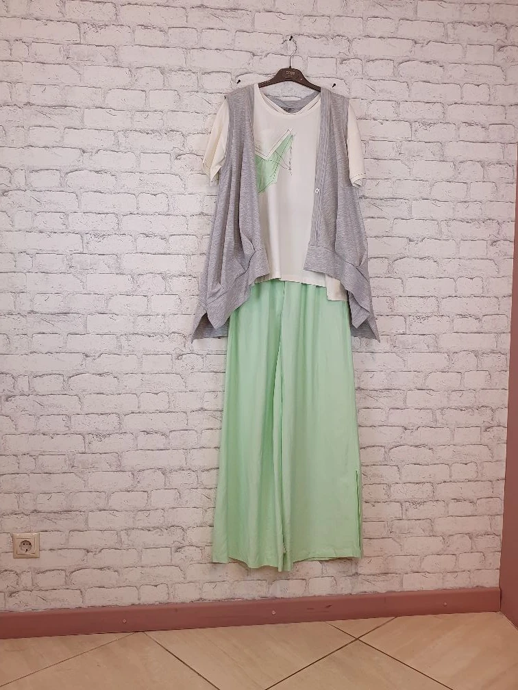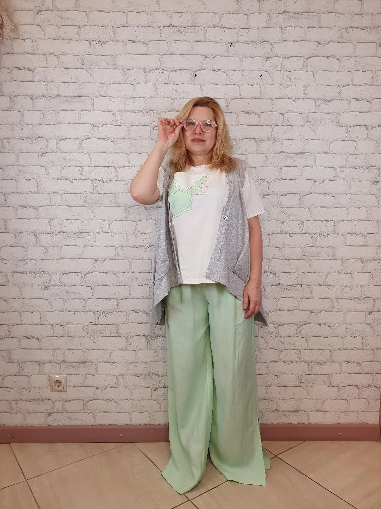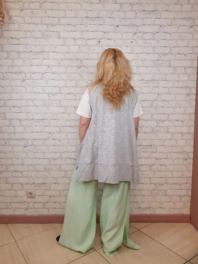 Стиль и посадка: свободный силуэт, длинная длина (спинка чуть длиннее), асимметричная драпировка спереди, V‑вырез.Застежка на кнопку— надевается поверх футболки или блузы. - Материал: мягкий трикотаж, приятный к телу, сохраняет форму и комфорт при носке. - Сезон: демисезон / межсезонье. - Образ: casual‑chic — отлично сочетается с футболкой и широкими брюками, джинсами или платьем; можно носить с кедами или лоферами, добавить пояс для более приталенного силуэта. - Особенности: универсальный базовый элемент, хорошо подходит для многослойных комплектов и офис‑кэжуал.
