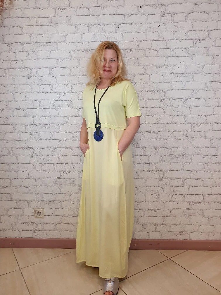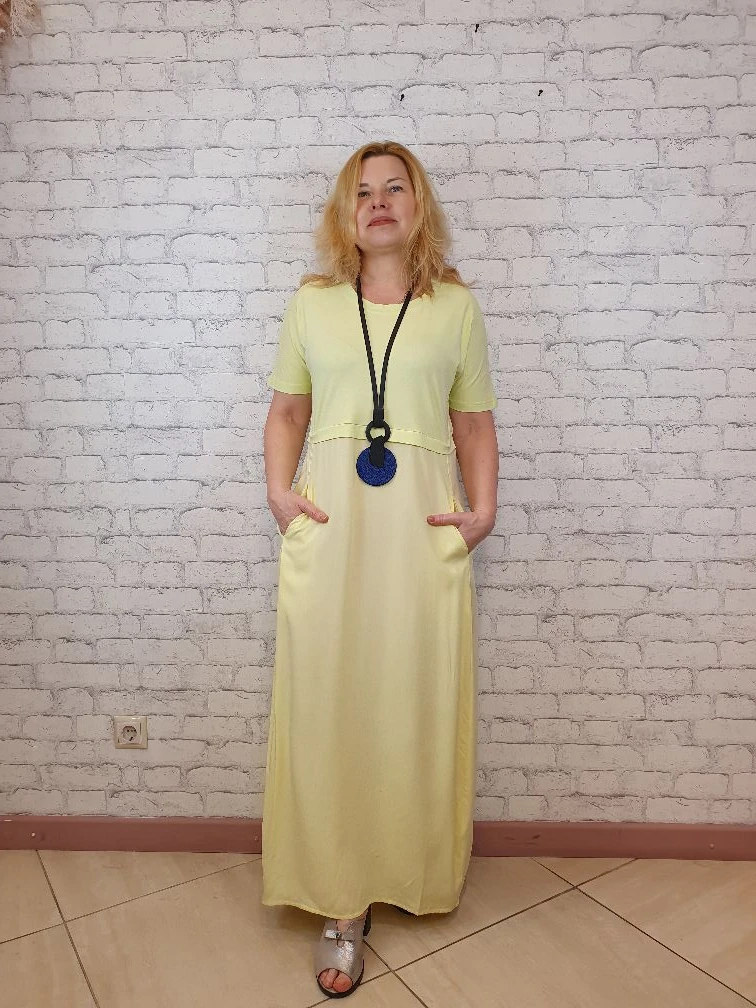 - Конструкция: платье с эффектом «двойного слоя» — укороченный трикотажный верх и прикреплённый макси‑низ.