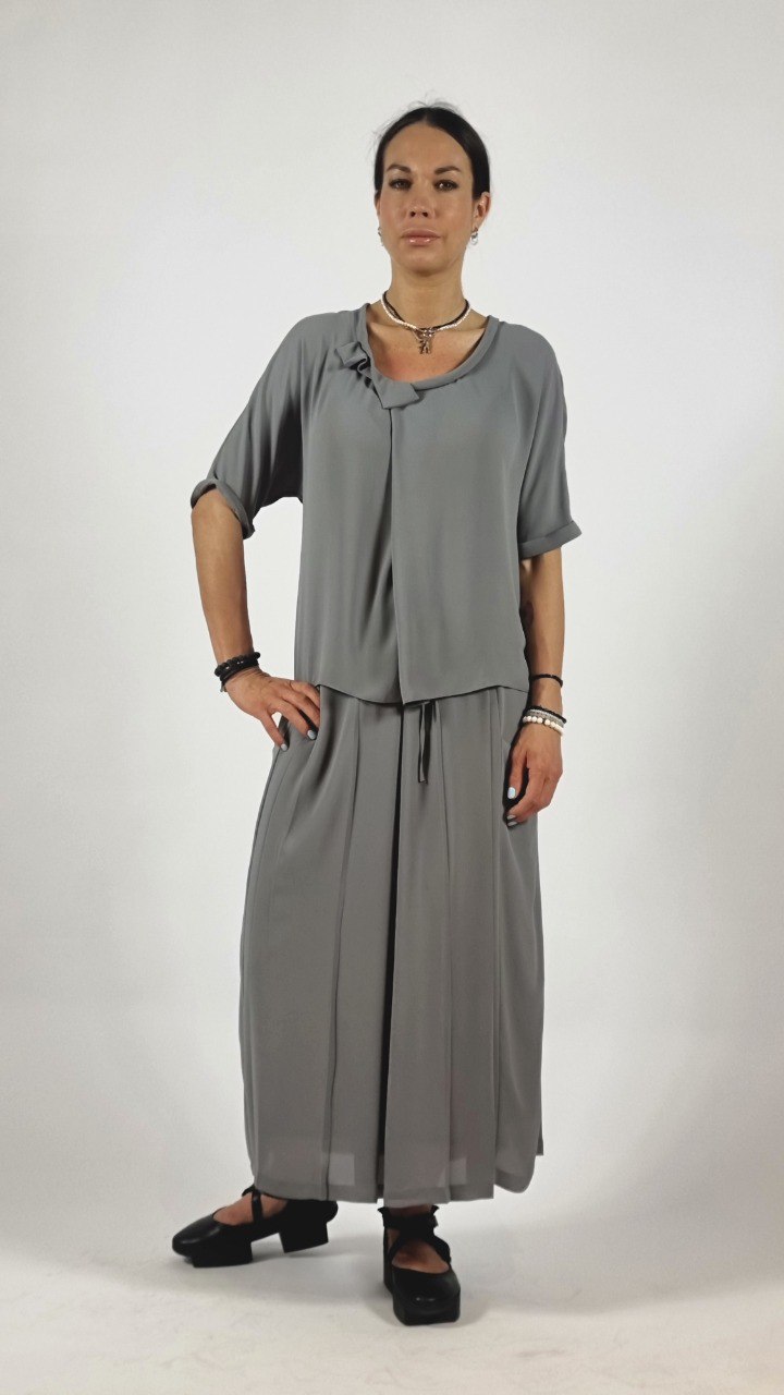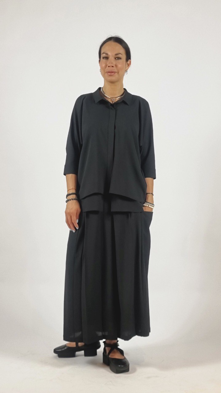 - Силуэт и посадка: макси длина, свободный расклешённый силуэт с равномерными мягкими складками — обеспечивает движение и скрывает проблемные зоны.
